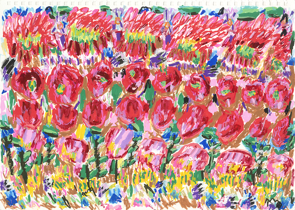 1992年生まれ 仙台市在住。2011年多夢多夢舎在籍。いつも一番乗りで、多夢多夢舎の一日は、彼のあいさつから始まる。はじめは小さな丸を並べるだけだったが、サインペンを使うようになってから全体を観て余白を生かすようになった。絵の具、色鉛筆を駆使して、デザイン性の高いものを仕上げている。一度会った人の名前は(たまにしか)忘れない。