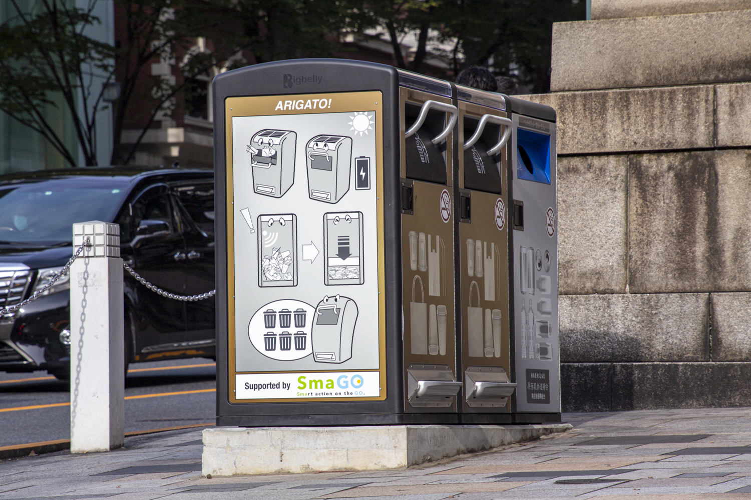 「SmaGO」は、IoTを活用したスマートゴミ箱で、ゴミの堆積状況を逐次クラウドに送信してリアルタイムでゴミの堆積状況を確認できます。ゴミ箱内のセンサーがゴミを検知し、ゴミが溜まると自動的に約1/5まで圧縮され、限られたゴミ箱のスペースを最大限活用することでゴミ回収の効率化につなげます。また、上部のソーラーパネルで発電し動作するため、環境にやさしく電気代も不要です。また、SmaGOを企業の協賛による広告メディアとして活用することで、広告主にとって企業のCSR活動につながるモデルとして展開しています。