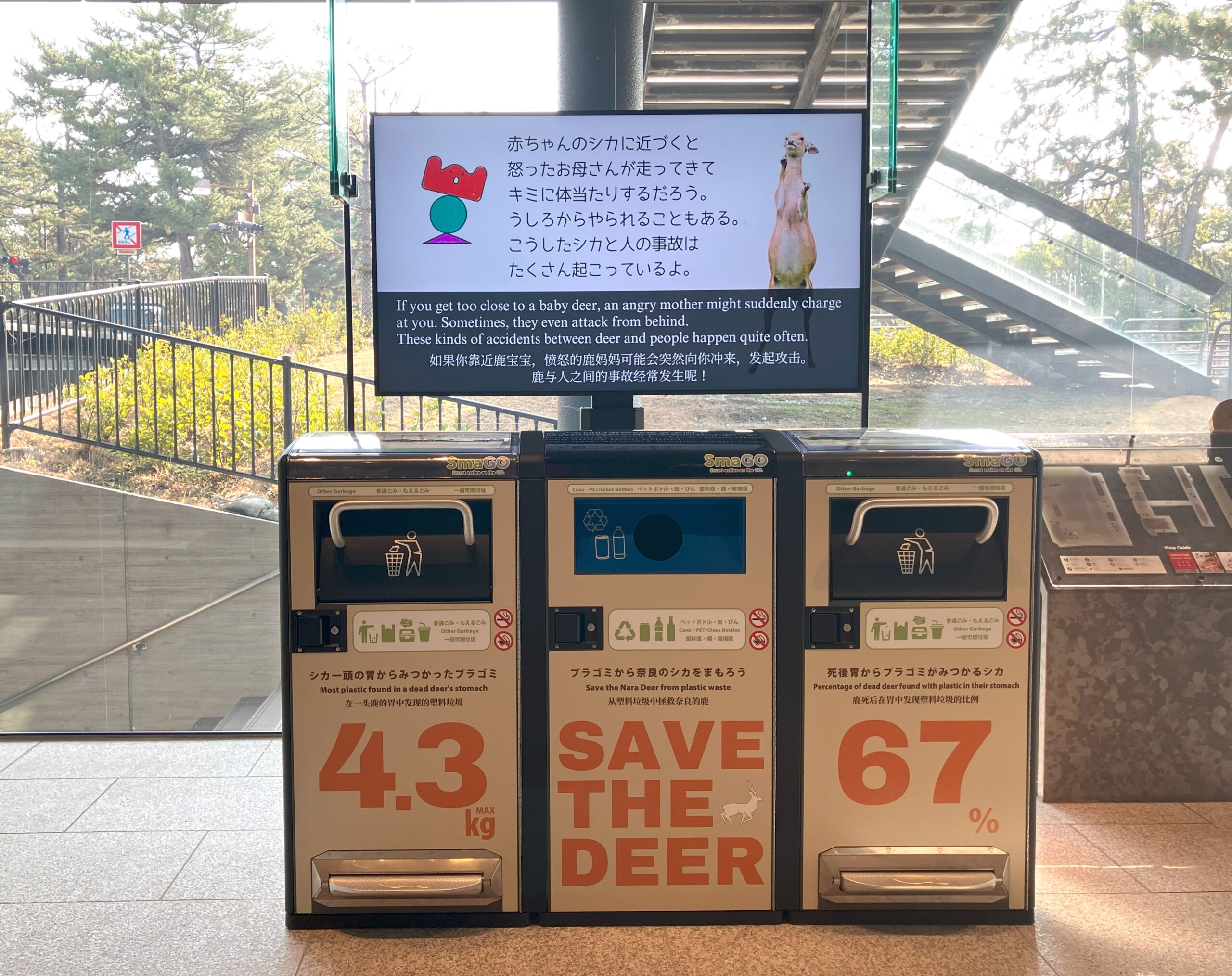 奈良公園バスターミナル内にシカの保護を啓発するためのサイネージが設置されました。来訪者に向けて、シカとの適切な距離感について解説されています。