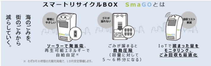「Smart action on the GO」(環境のための具体的なアクションを続けていく)をスローガンに、⽇本 各地へのスマートゴミ箱「SmaGO(スマゴ)」の設置を通して、街と企業と⼈々が⼀体となった環境活動を提案しています。